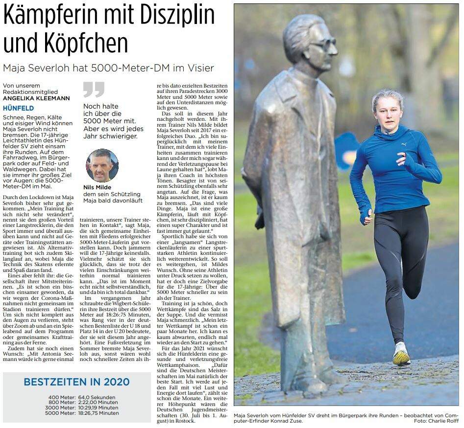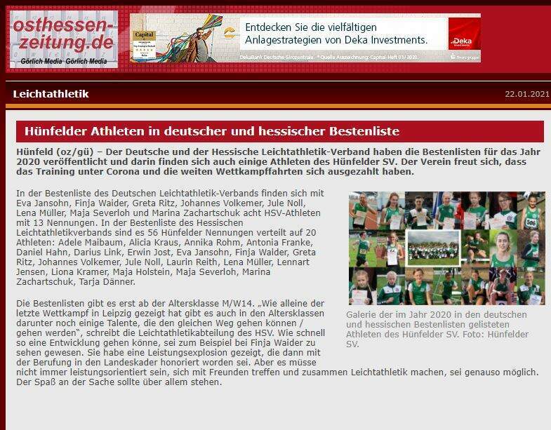 Die Bestenlisten des Deutschen und des Hessischer Leichtathletik-Verbandes für das Jahr 2020 sind veröffentlicht worden. Darin taucht auch immer mal wieder „Hünfelder SV“ auf! Das Training unter CORONA und unsere weiten Weitkampffahrten in die Ferne haben sich ausgezahlt. Die Deutschen Bestenlisten enthalten 13 Nennungen. Von unseren Athleten sind dabei gelistet: Eva Jansohn, Finja Waider, Greta