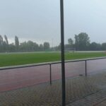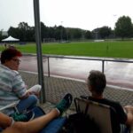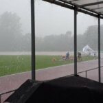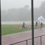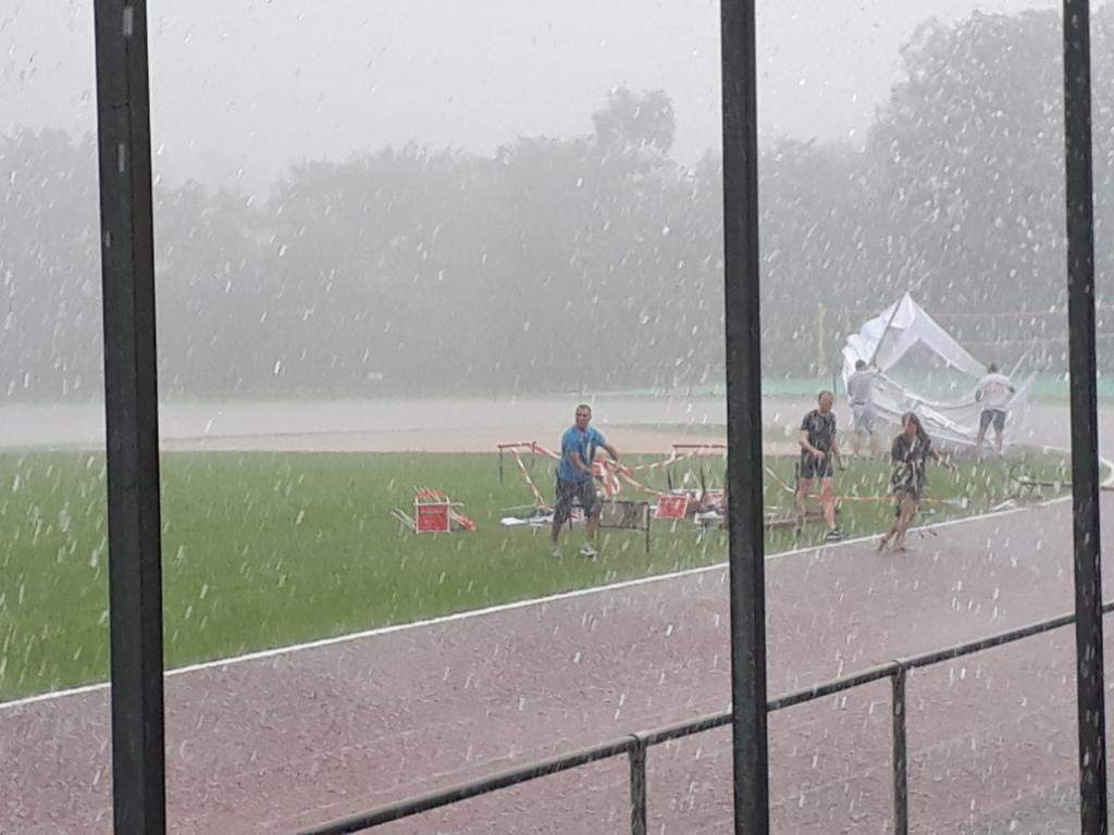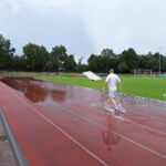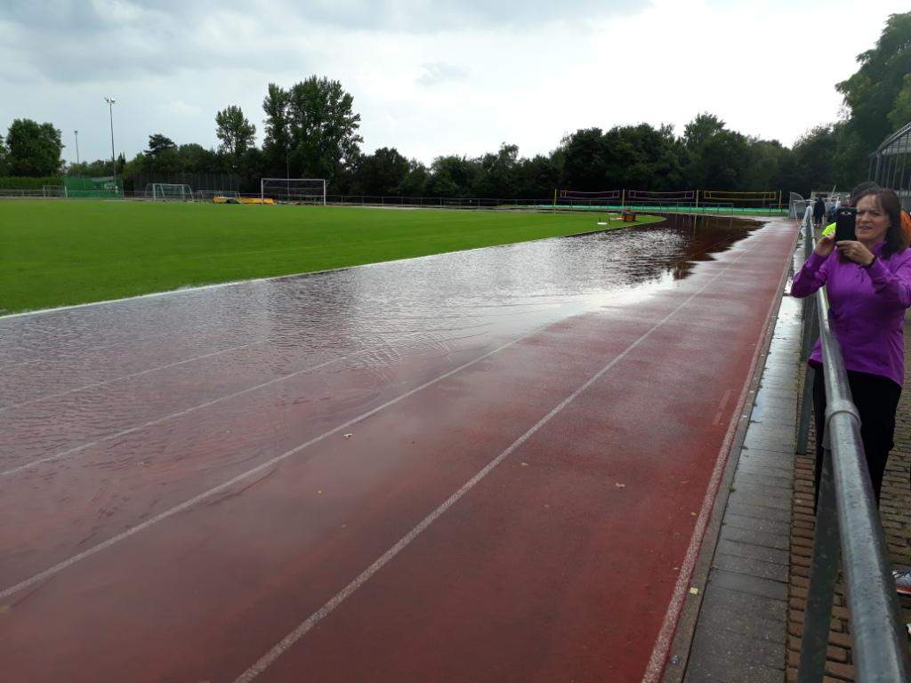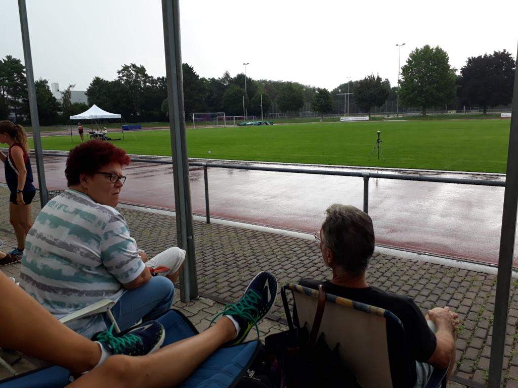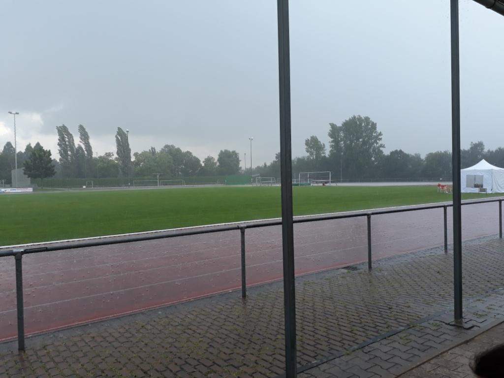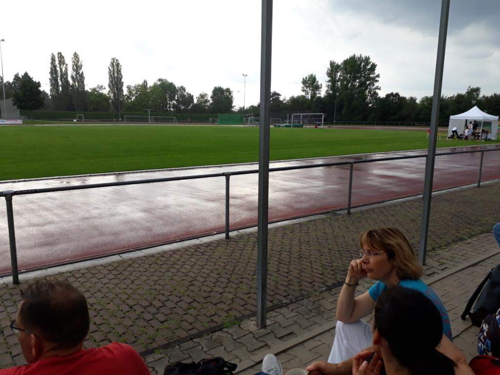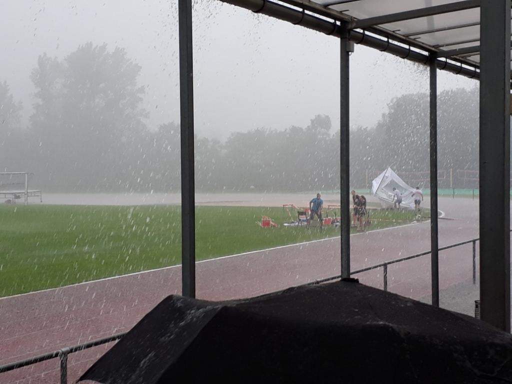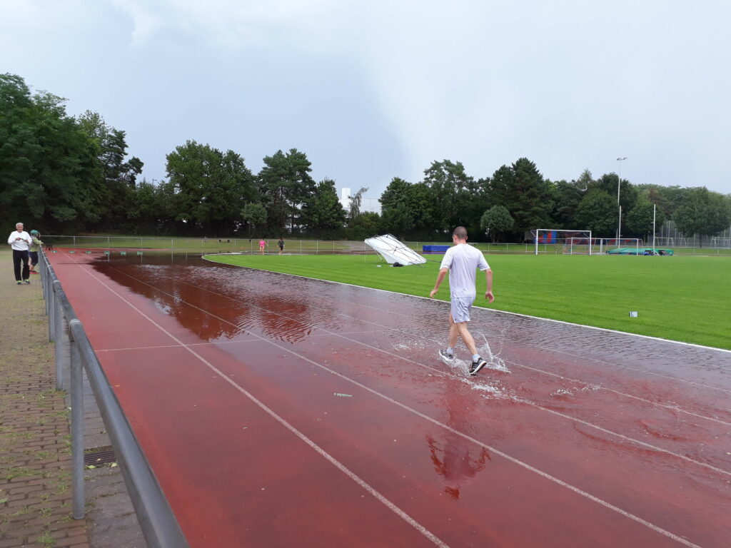 Der geplante Start von Maja und Marina über 800m viel dann aber sprichwörtlich ins Wasser. Nach einem sehr heftigen Gewitter (siehe auch Bilder) musste die Veranstaltung abgebrochen werden (Bahn unter Wasser, Zeitmessanlage defekt). So ging es dann pitschnass auf die Rückreise; alle die auf der Tribüne Schutz vor den Wassermassen gesucht hatten waren nach einer Windböe, die das Wasser förmlich auf die Tribüne peitschte, bis auf die Haut durchnässt.