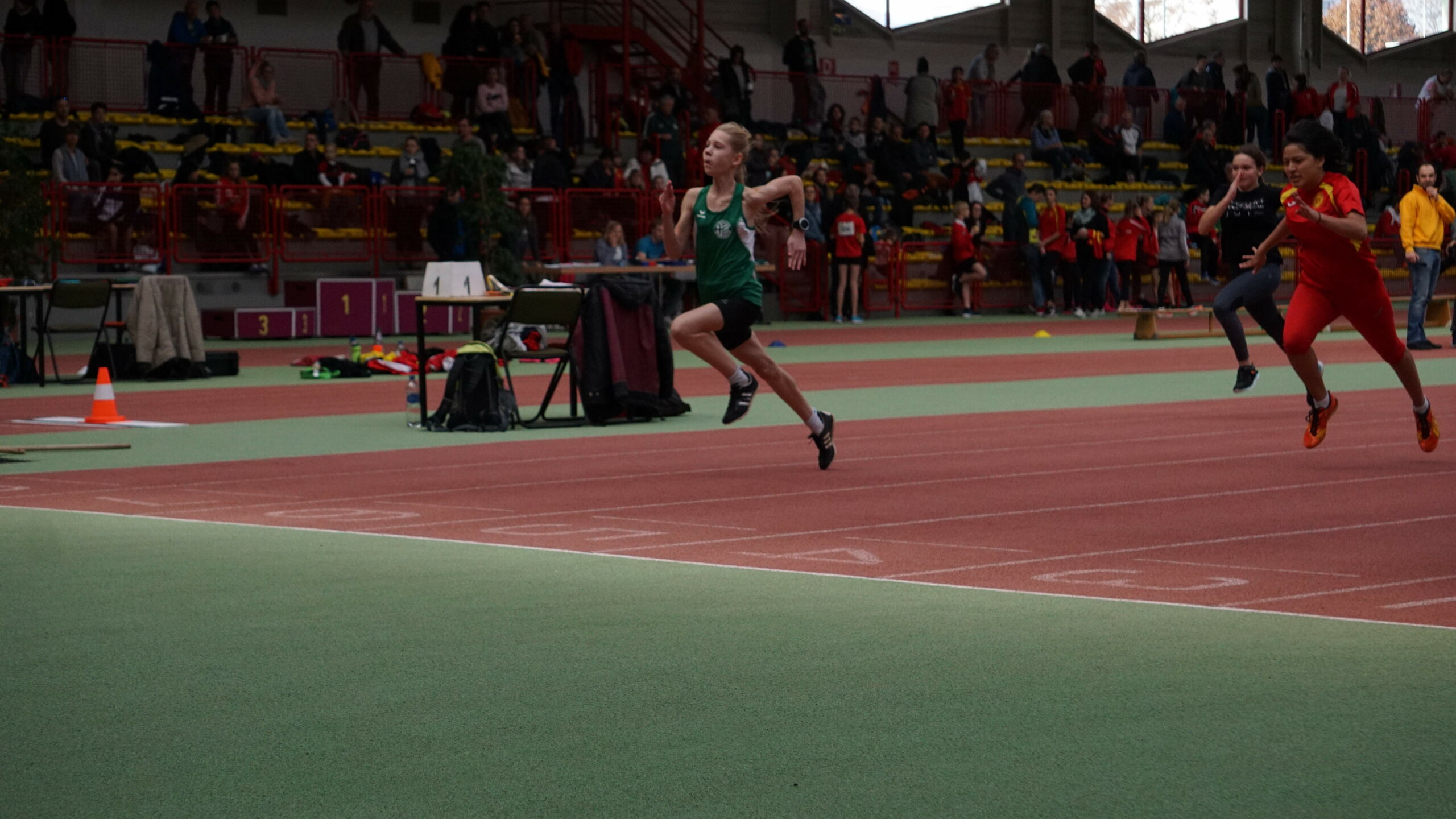• Marlene Giebel (W10), genau wie Rosalie und Lilli erstmals auf der 200m-Rundbahn in einer Leichtathletikhalle unterwegs und alle drei viel zu schnell angegangen. Mit einem kontrollierten Lauf geht das bei allen Dreien schneller; bei allen Dreien wird man in einem überschaubaren Zeitraum am Anfang eine „2“ bei der zeit stehen sehen!