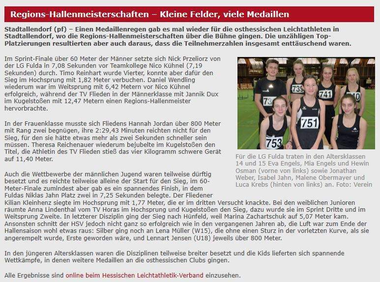 Für einen Start bei den Hallenmeisterschaften der Region Mitte (Marburg-Biedenkopf, Gießen, Wetzlar, Dillenburg, Fulda, Vogelsberg) waren heute 11 Hünfelder Leichtathleten vorgesehen; tatsächlich zum Einsatz kamen dann aber nur 10 Athleten.